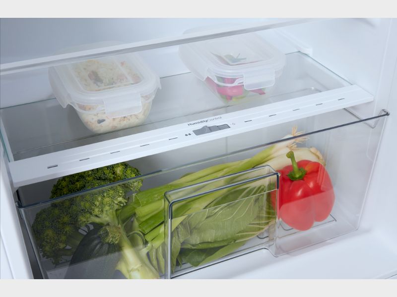 De overzichtelijke indeling met vier glazen legplateaus met lekrand en een transparante groentelade met luchtvochtigheidsregeling zorgt voor praktisch gebruiksgemak. Dankzij de elektronische thermostaat blijft de temperatuur stabiel en met de SuperCool-functie breng je nieuwe boodschappen snel op de juiste temperatuur.