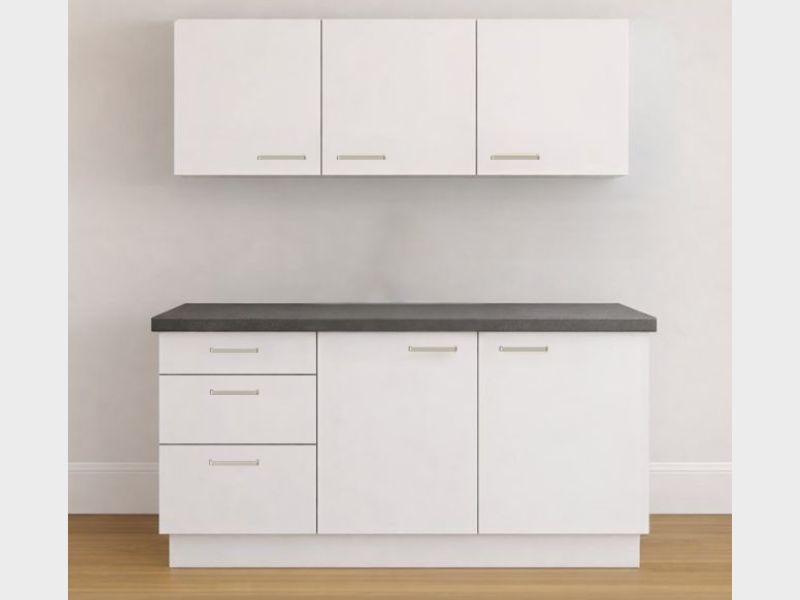 Het keukenblok wordt standaard geleverd met een onderkast met drie lades, 2 onderkasten met verstelbare legplank, aangevuld met 3 bijpassende hangkasten voor extra opbergruimte.