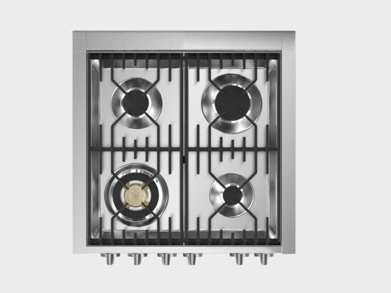 De vier messing gasbranders geven je volledige controle over elke kooksituatie. Van zacht sudderen tot krachtig wokken — elke brander heeft zijn specifieke rol: